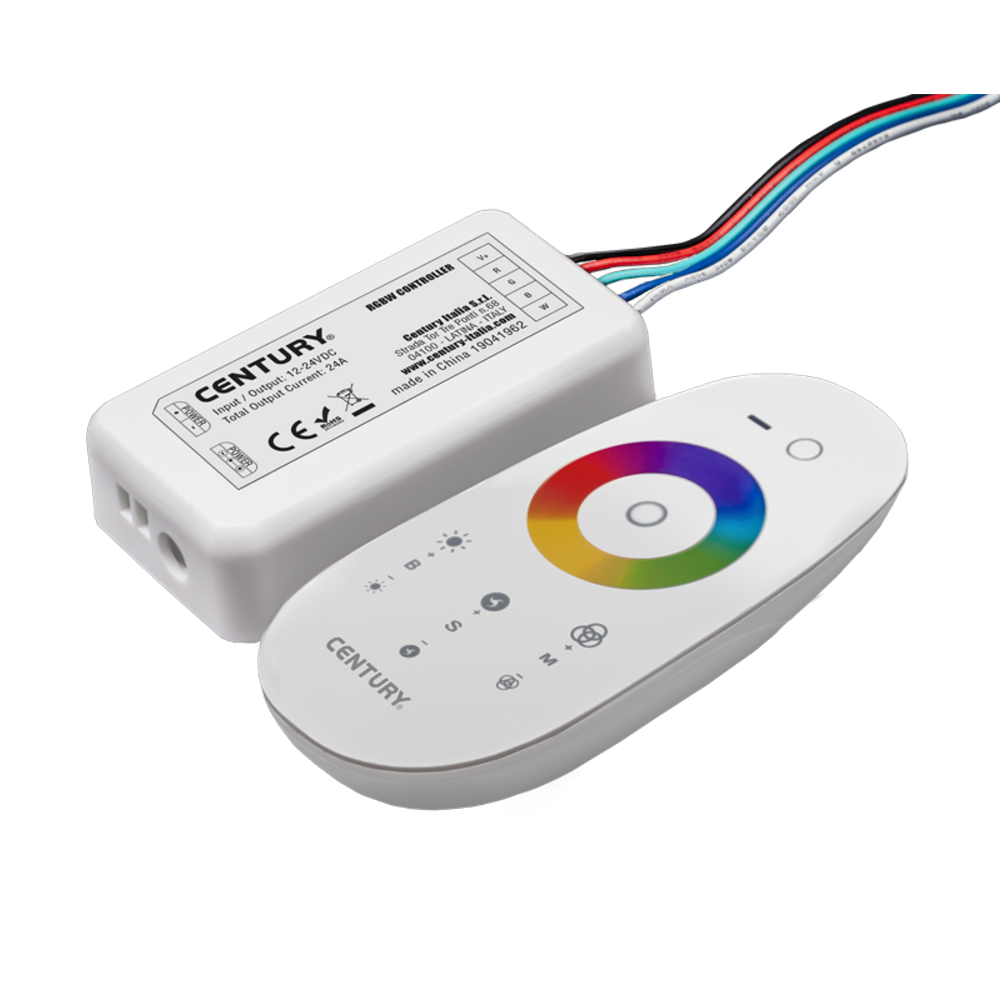 Kit composto da telecomando touch RF 2.4 GHz e Controller a 4 canali (RGBW) per il controllo remoto di Strip LED.